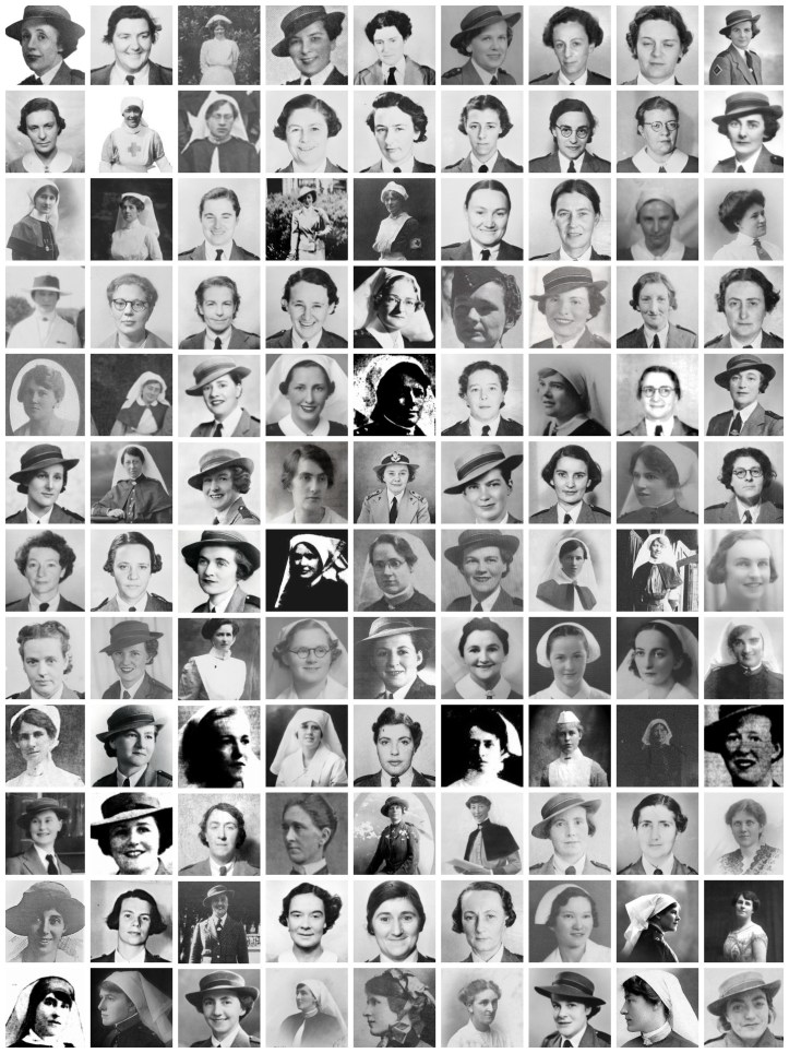 Ninth row: Staff Nurse Ada Thompson, Sister Bessie Wilmott, Sister Margaret Jackson, Captain Ellen Donohue, Lieutenant Jenny Walker, Staff Nurse Edith Reed, Staff Nurse Blanche Atkinson ARRC, Staff Nurse May Hennessy, Lieutenant Nita Prideaux.