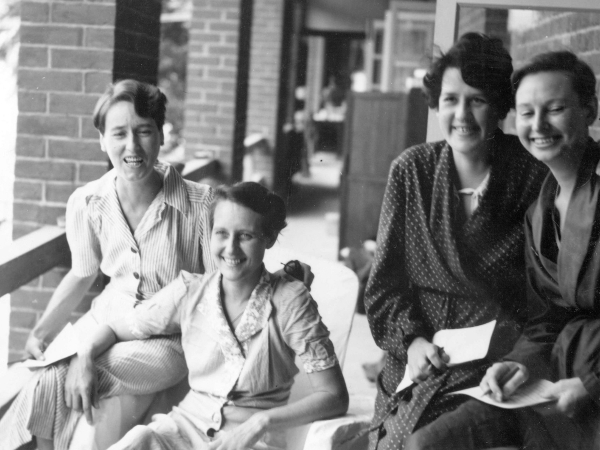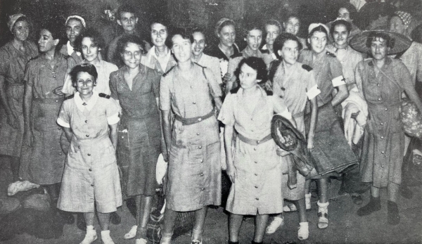 Rescued AANS nurses at a Gracie Fields concert held at the former residence of Japanese General Saito for Australian ex-POWs, Changi area, Singapore, 1 Oct 1945. Left to right: Vivian Bullwinkel (obscured), Beryl Woodbridge, Iole Harper, Elizabeth Simons, Eileen Short, Veronica Clancy, Mavis Hannah. (AWM 118809)