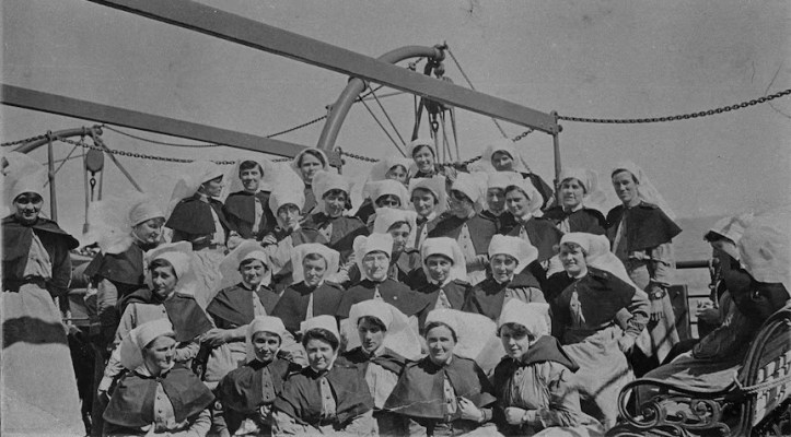 The Wyreema departed Fremantle on the following day at around 5.00 pm. As it steamed away, boats at anchor in the harbour blew their whistles as their passengers waved flags and cooeed. During the voyage the nurses read, sewed, played cards and games on deck, attended church services, boat and fire drills, dinners and concerts, and even staged a play called ‘Search Me,’ in which Rosa and another nurse acted the part of Bluebeard splendidly.