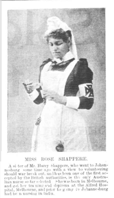 A number of sources suggest that Rose nursed in India for a time. It was also reported in the Jewish Herald on 22 December 1899 that “not long ago [Rose] undertook a long sea trip in charge of a troublesome patient, whom she, at the end of a few months, restored to her relatives perfectly cured.” On 24 October 1896 a Miss Shappere boarded the RMS Orotava in Melbourne with a Miss Affleck and embarked for Colombo. They returned to Albany aboard the RMS Oruba on 29 January 1897 and continued on to Melbourne. It is not certain that this “Miss Shappere” was Rose, and of course Ceylon is not India, but the timing fits neatly with the report in the Jewish Herald.