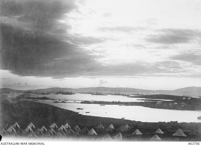 By this time the AIF men of the first and second convoys had struck camp at Mena and Heliopolis respectively and sailed from Alexandria to the Greek island of Lemnos, which lay in the Aegean Sea 100 kilometres west of Ottoman Turkey. Here they joined Allied forces – British, Indian, French and New Zealand – assembling ahead of a campaign against the Turks on the Gallipoli Peninsula. Preparations for the campaign had begun in late February with the arrival on the island of Rear Admiral Rosslyn Erskine Wemyss, the newly appointed governor of Lemnos, who had been tasked with establishing an advanced base around Mudros Harbour in the south of the island. Within two or three weeks, two floating docks, a wireless station, a coaling base and other infrastructure had been constructed.