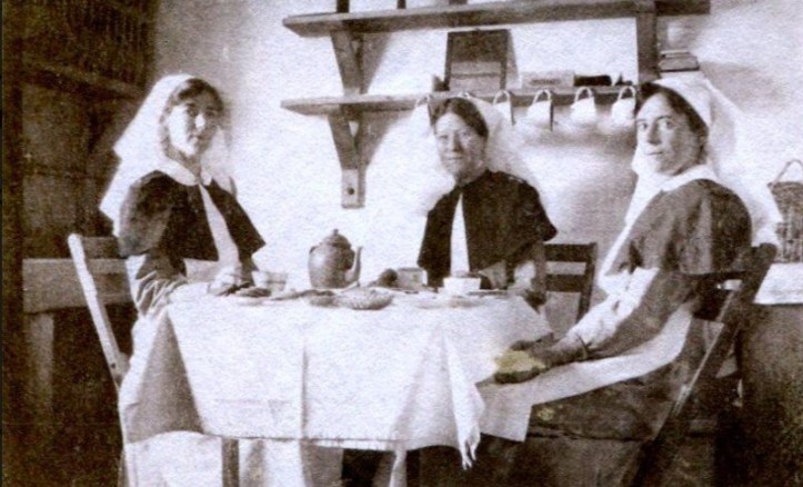The nurses now wore their updated outdoor uniforms, which consisted of a coat and skirt of grey wincey (instead of a top coat), with a grey felt sailor hat swathed with chocolate-coloured crepe de chine.